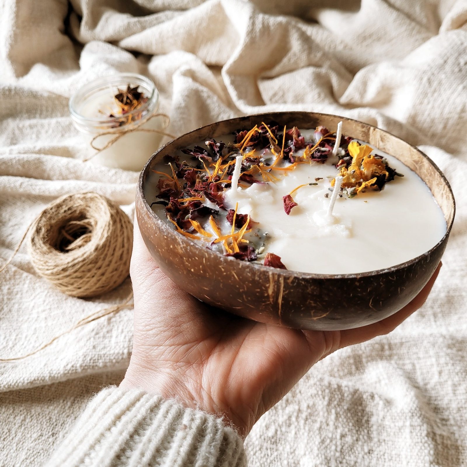 na dozdobení: sušené květy (růže, měsíček, levandule, divizna), koření (hřebíček, badyán, skořice)