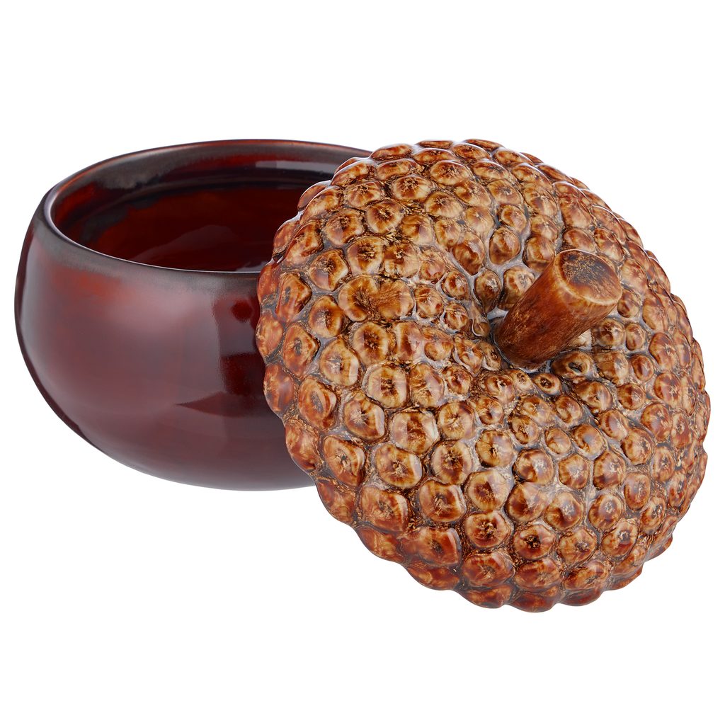 Dekorativní dóza ACORN, který evokuje atmosféru zimního lesa, je pečlivě vyrobená keramická nádoba ve tvaru moruše, která do Vašeho domova vnese teplo a přírodní kouzlo. Její lesklý hnědý glazovaný podstavec elegantně kontrastuje s víčkem, jehož textura věrně napodobuje klobouk moruše. Jedinečná dekorace na Vaši poličku, komodu nebo sváteční stůl - praktická a dekorativní zároveň.