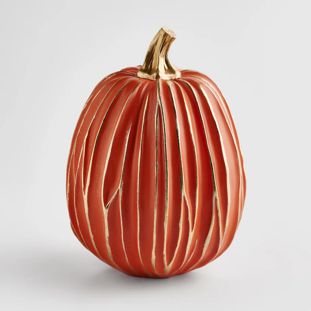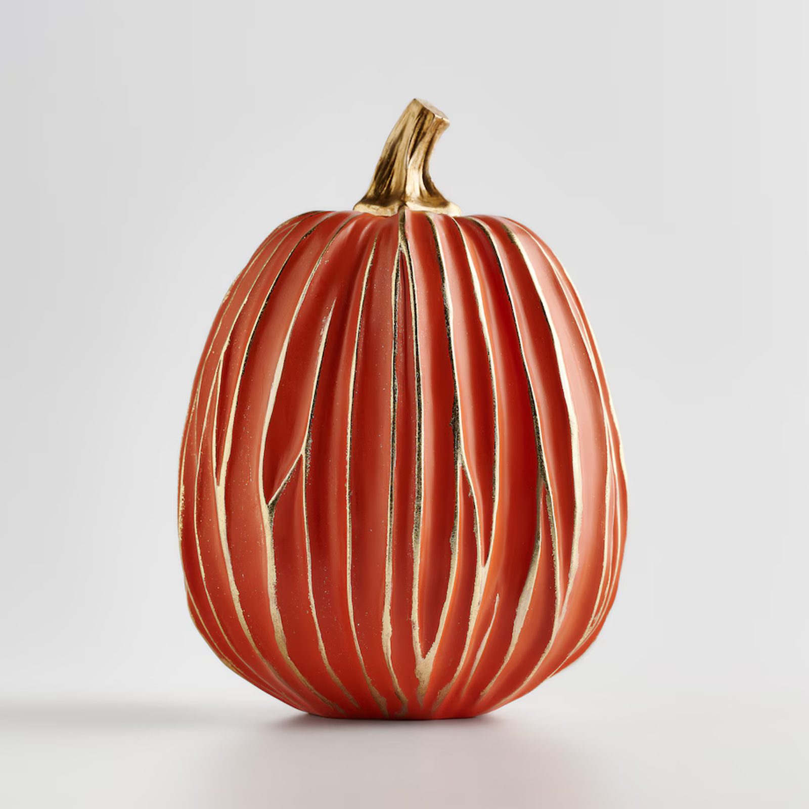 Dýně jsou neodmyslitelnou součástí podzimu, v kuchyni i při dekoraci domova. Zaoblený tvar, teplá oranžová barva této dekorativní dýně elegantně přinesou přírodu na Váš jídelní stůl, komodu nebo konferenční stolek.
