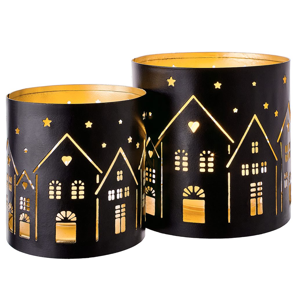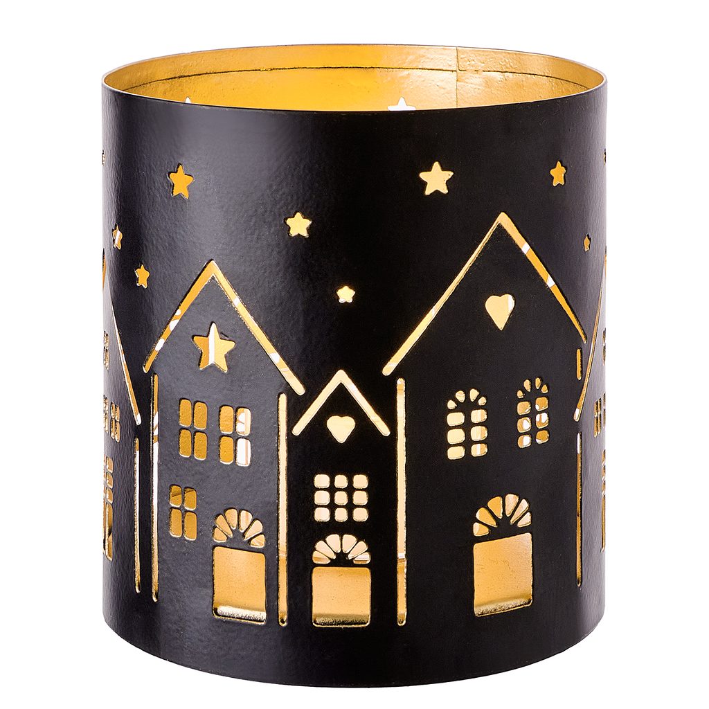Železné lucerny LUMINOUS s černým exteriérem a zlatým interiérem, s otvory, které evokují teplo domova, a blikajícími světly svíček vytvoří ve Vašem domově útulnou atmosféru. Ať už jde o večer zachumlaný na pohovce, nebo o večeři s přáteli u prostřeného stolu, lucernu LUMINOUS uplatníte u kterékoliv příležitosti.