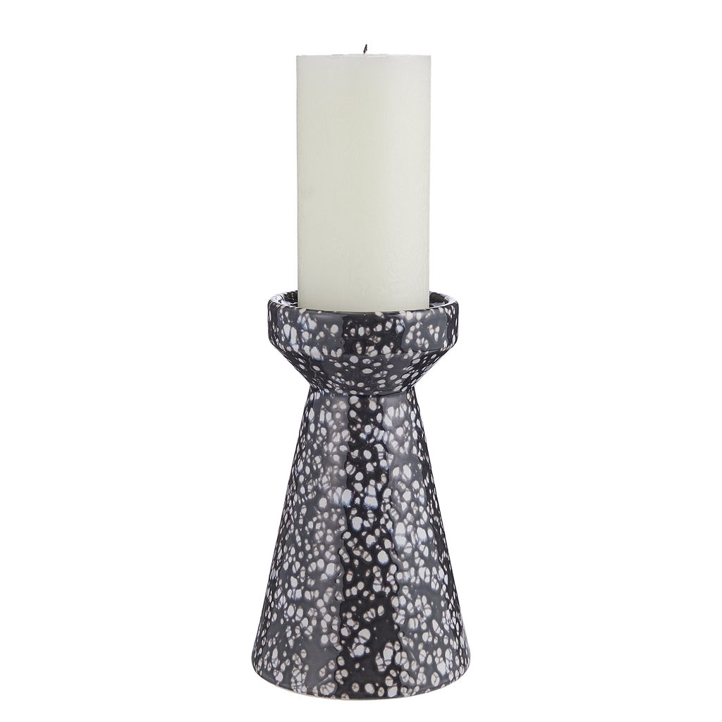 Černý svícen SPECKLE s charakteristickým tvarem a tečkovaným povrchem se stane výrazným doplňkem každé domácnosti. Vyrobený z keramiky je ideální pro doplnění stylu na decentně zdobených stolech, nebo jako samostatná dekorace na komodě či malém stolku.