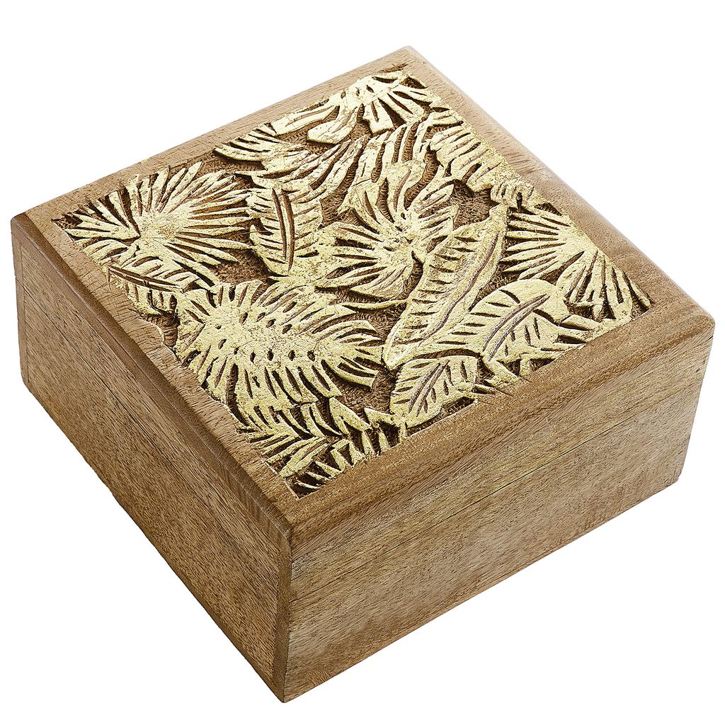 Pokud jde o dekoraci, krabička GOLDEN JUNGLE z mangového dřeva je skutečnou truhlou pokladů. Její vyřezávaný motiv zlatých lístků téměř odvádí pozornost od toho, že do ní můžete pohodlně uložit šperky, sponky do vlasů a další drobnosti. K dostání ve dvou velikostech.