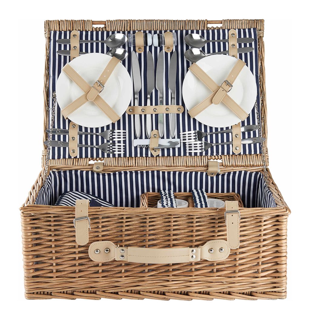Piknik na zelené louce se skutečným keramickým nádobím – to je styl! Tradiční piknikový koš A DAY IN THE PARK z vrbového proutí s praktickým držadlem je uvnitř vyložen pruhovanou lněnou látkou. Víko je pevně připevněno přezkami. Všechny součásti jsou bezpečně uložené uvnitř koše, a přesto zůstává dostatek prostoru na zabalení několika lahodných dobrot.