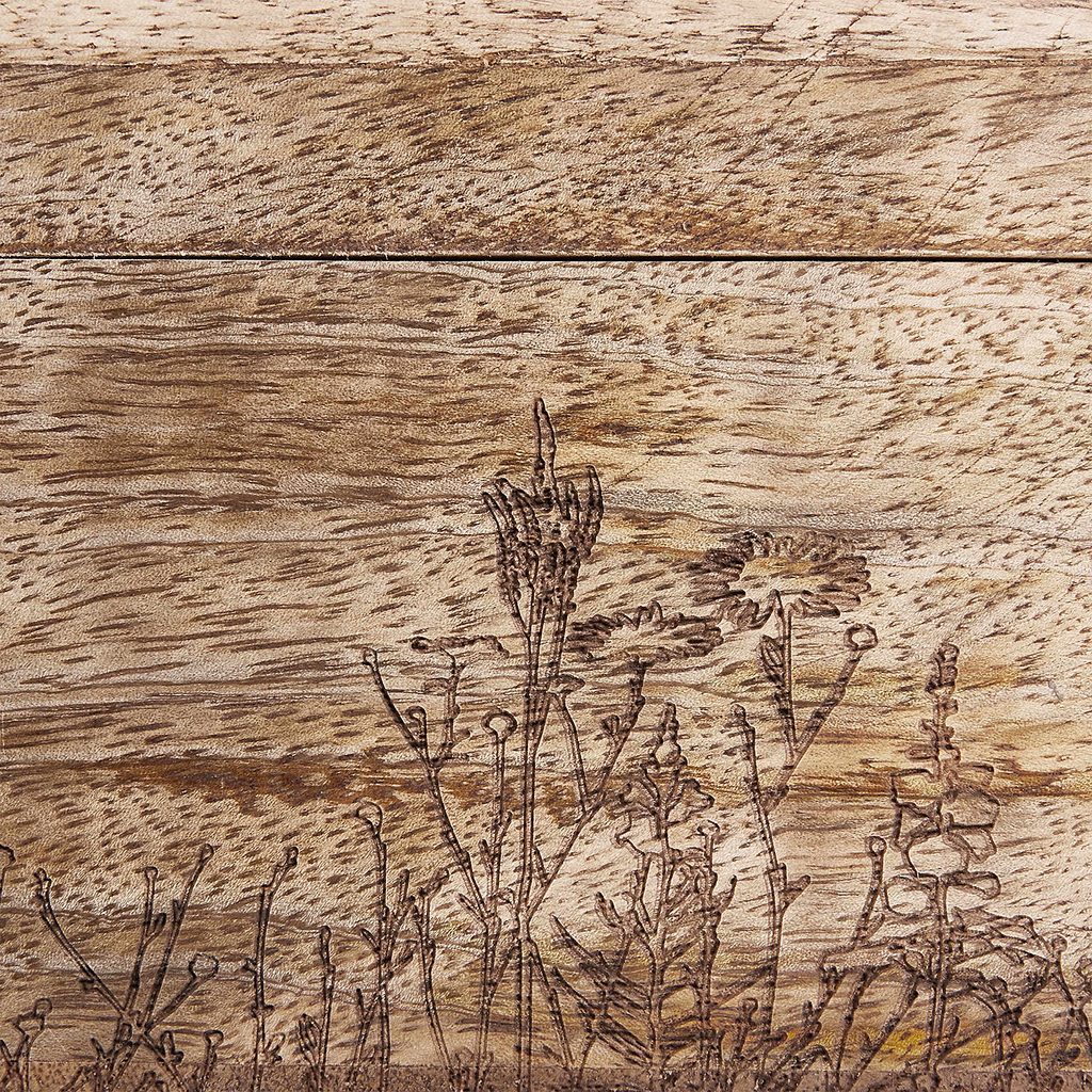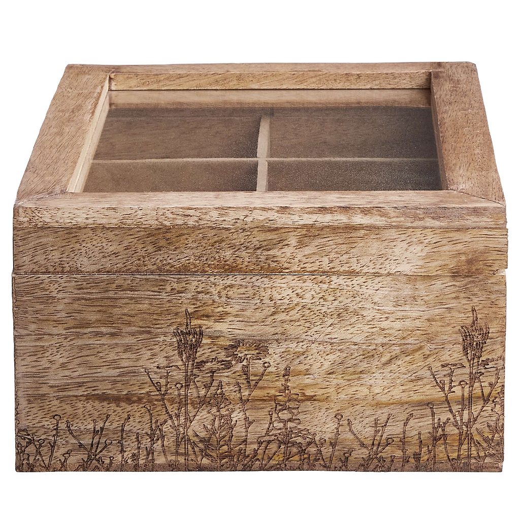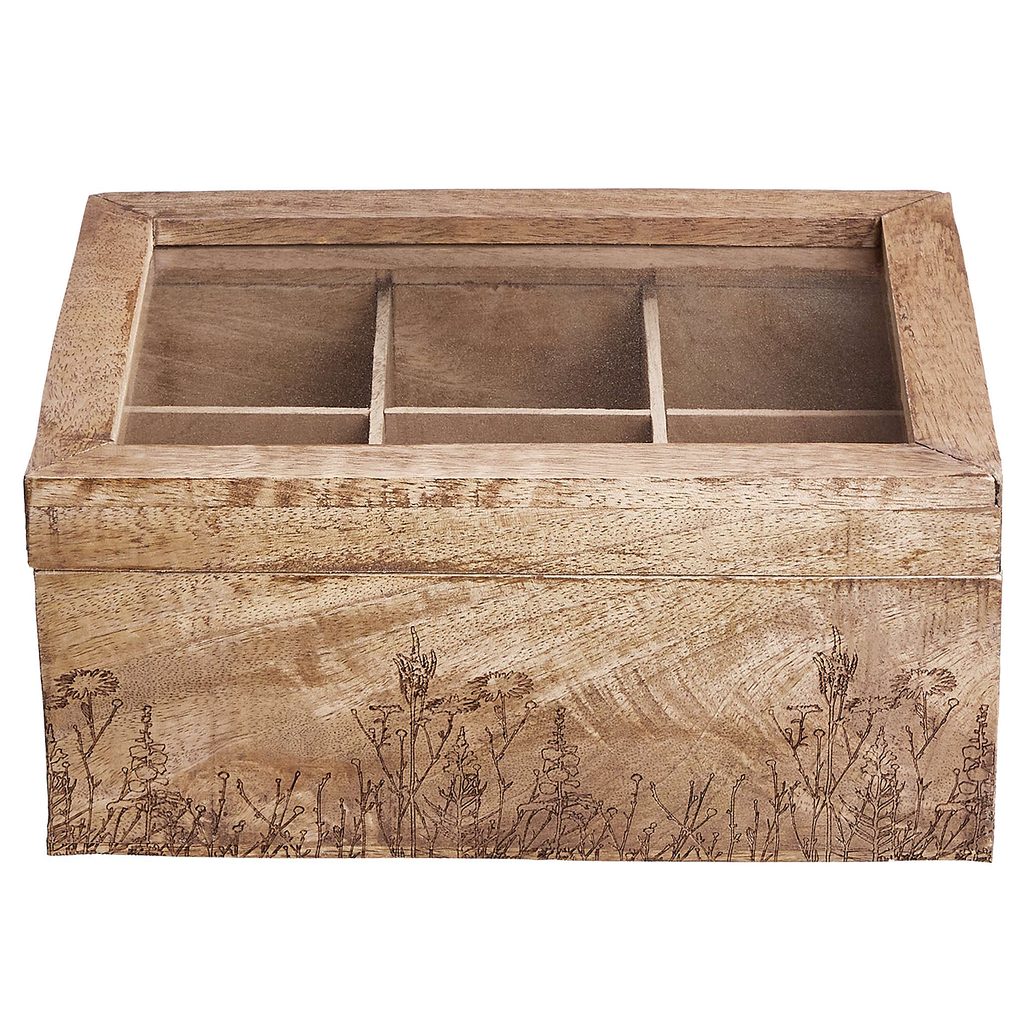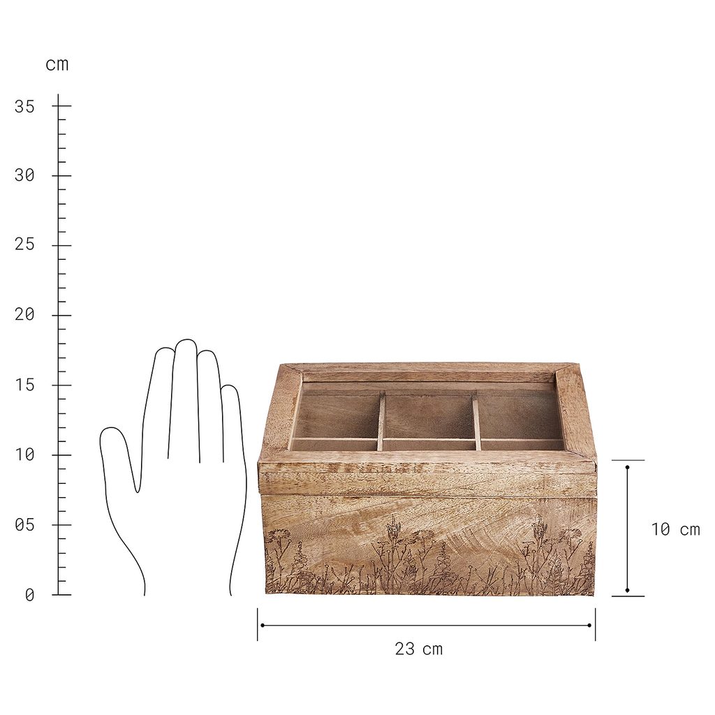 Všechny Vaše čaje po ruce: v čajové krabičce TEA TIME s gravírovanými květy z hnědého mangového dřeva můžete dekorativním způsobem uložit spoustu čajových sáčků. Krabička je tak krásná, že ji můžete nechat na snídaňovém stole nebo na kuchyňské lince a vykouzlí Vám jarní atmosférou úsměv na tváři při každém pití čaje.