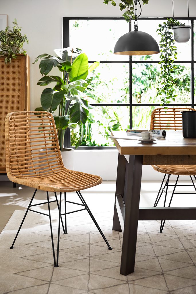 S ratanovou židlí HACIENDA si do kuchyně či jídelny pořídíte moderní pohodové sezení a jednoduchý styl bydlení. Kombinace hnědého ratanu a černé železné konstrukce působí na pohled harmonickým a povznášejícím dojmem a s podsedákem nebo ovčí vlnou ještě v mžiku získá na osobním šarmu.