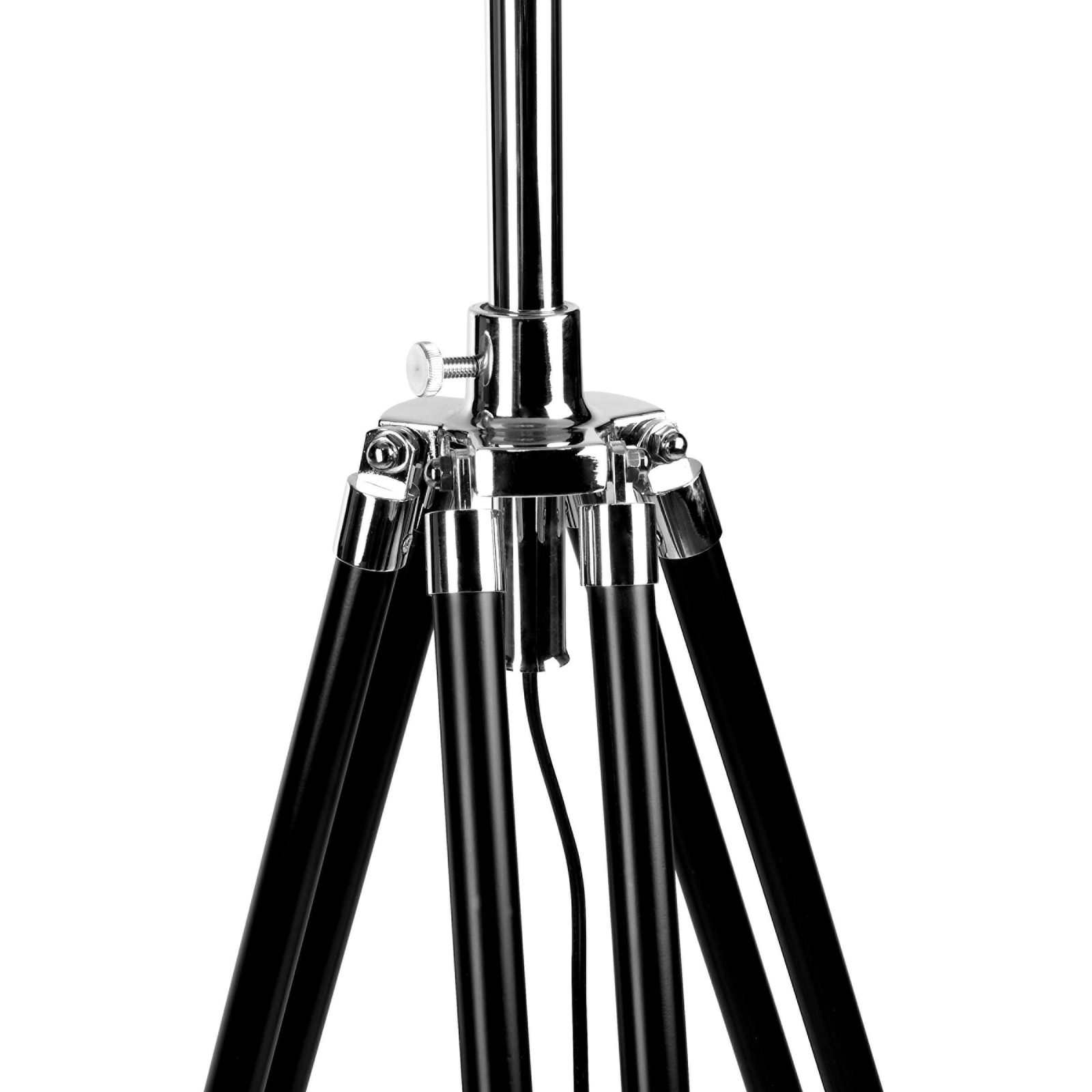 Dole stativ, nahoře světla, stojací lampa TRIPOD se studiovou atmosférou. Vzrušující kombinace pro trendy bydlení. Výškově nastavitelná lampa s černou nohou ze dřeva a středním dílem z chromu, se saténovým textilním stínítkem. S přepínačem, žárovka není součástí dodávky.