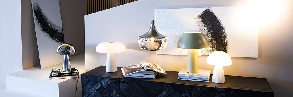 Jemně strukturovaný povrch, lesklé sklo a harmonický tvar houby dělá moderní stolní lampu FUNGI TOWN elegantní. Kovové tóny, mramor a kov ladí s tímto doplňkem stejně jako pastelové barvy a čisté interiéry.