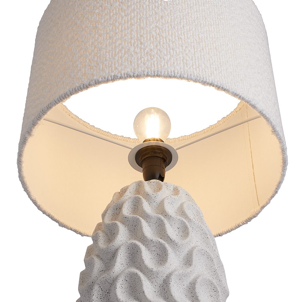 Keramický povrch s jemným vlněním se snoubí s texturovanou sponovou vazbou: bílá stolní lampa MARLENE harmonicky kombinuje různé struktury a materiály. Skvěle zapadne jak do moderního venkovského stylu, tak do interiérů inspirovaných pobřežím.