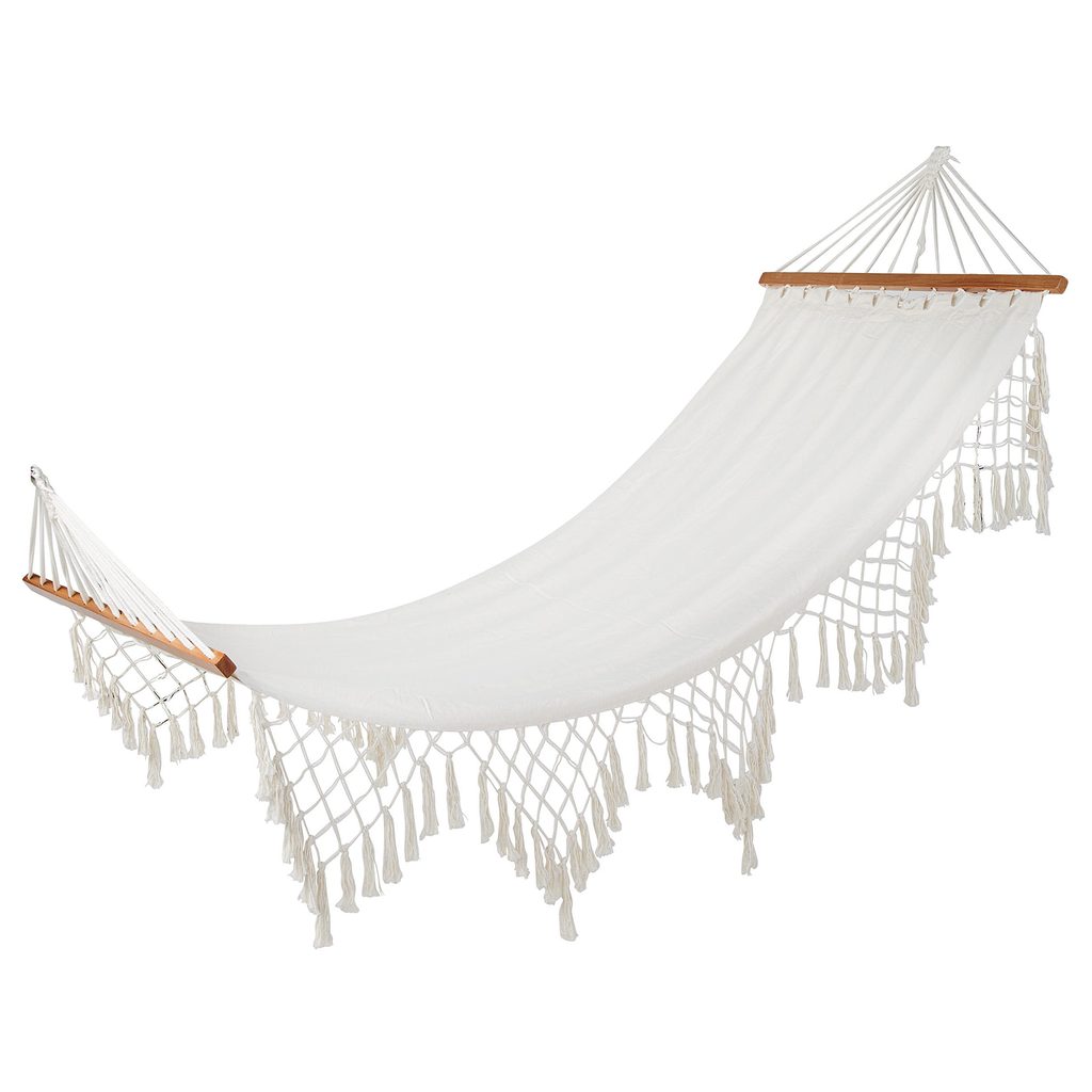 Krémová houpací síť se střapci SHOW ME HEAVEN: to zní jako dovolená, odpočinek a pocit, který povznáší duši. Jako chvilka strávená na slunci s dobrou knihou a vychlazeným drinkem, jako dětský smích na zahradě a motýli, kteří se prohánějí po modré obloze. A ještě lépe zní představa, že se můžete položit do vlastní houpací sítě z bavlny a polyesteru.