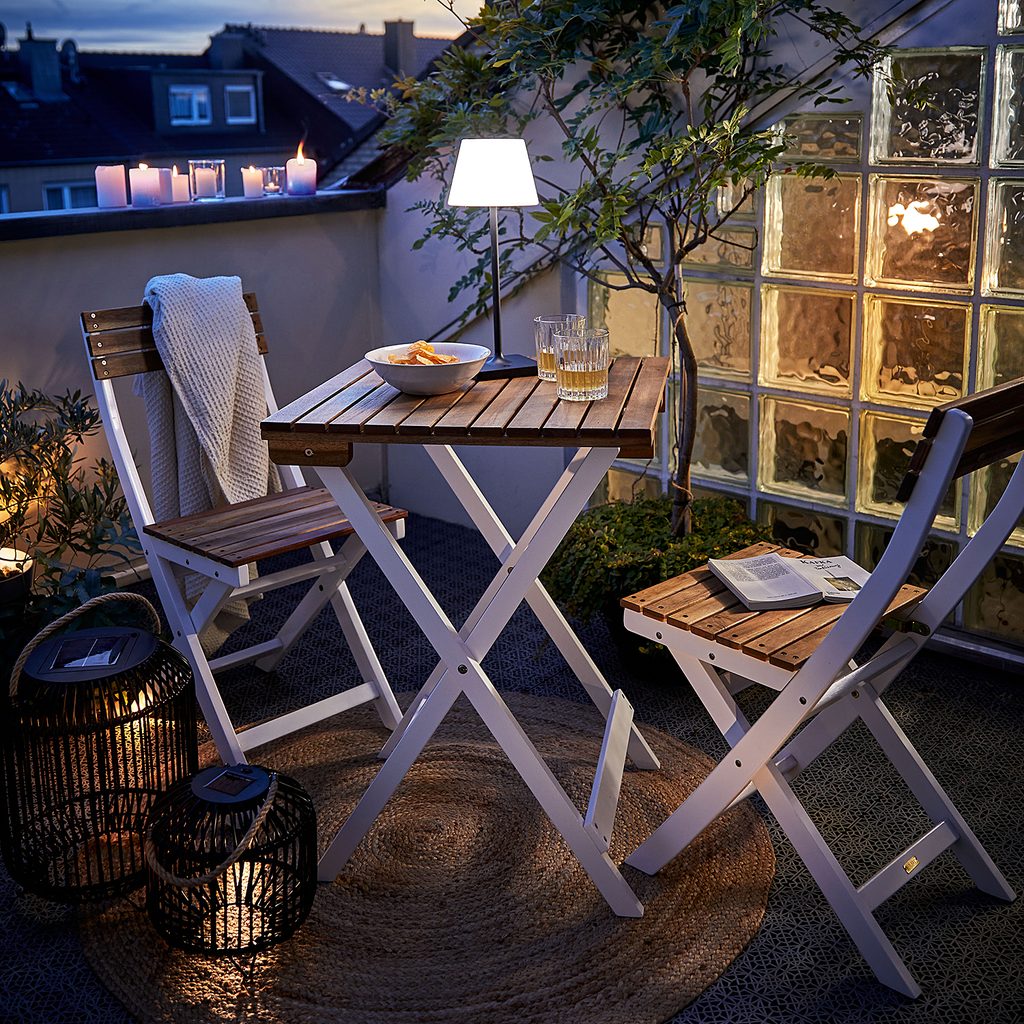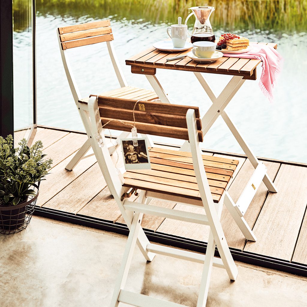Zahradní set MORNING STAR Vás při krásném počasí naláká, abyste se usadili a přivítali nový den šálkem kávy na zahradě, terase či balkónu. Z akátového dřeva v bílé a světle hnědé, s klasickým vzhledem a prakticky skládací.