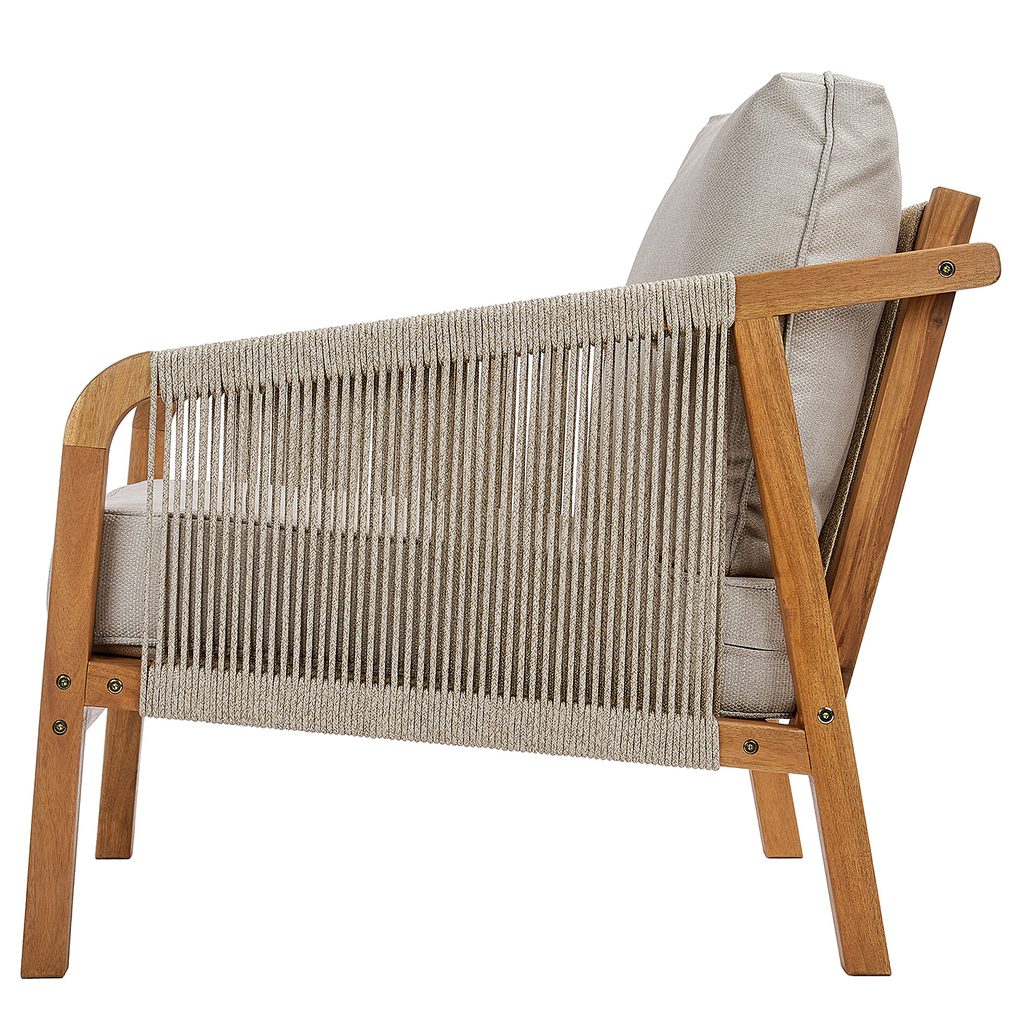 Přírodní barvy, pravé akáciové dřevo a módní provazové šňůry na područkách a opěradle: venkovní křeslo ROPE ISLAND má vše, co dělá jarní a letní relaxaci na terase nebo balkoně ještě krásnější. Pohodlné čalounění poskytuje vysoký komfort sezení a díky zipu se dá snadno sundat, takže jej lze v případě potřeby prát v ruce. V produktové řadě jsou i ladící stolky, se kterými proměníte Váš prostor v útulný venkovní obývací pokoj.