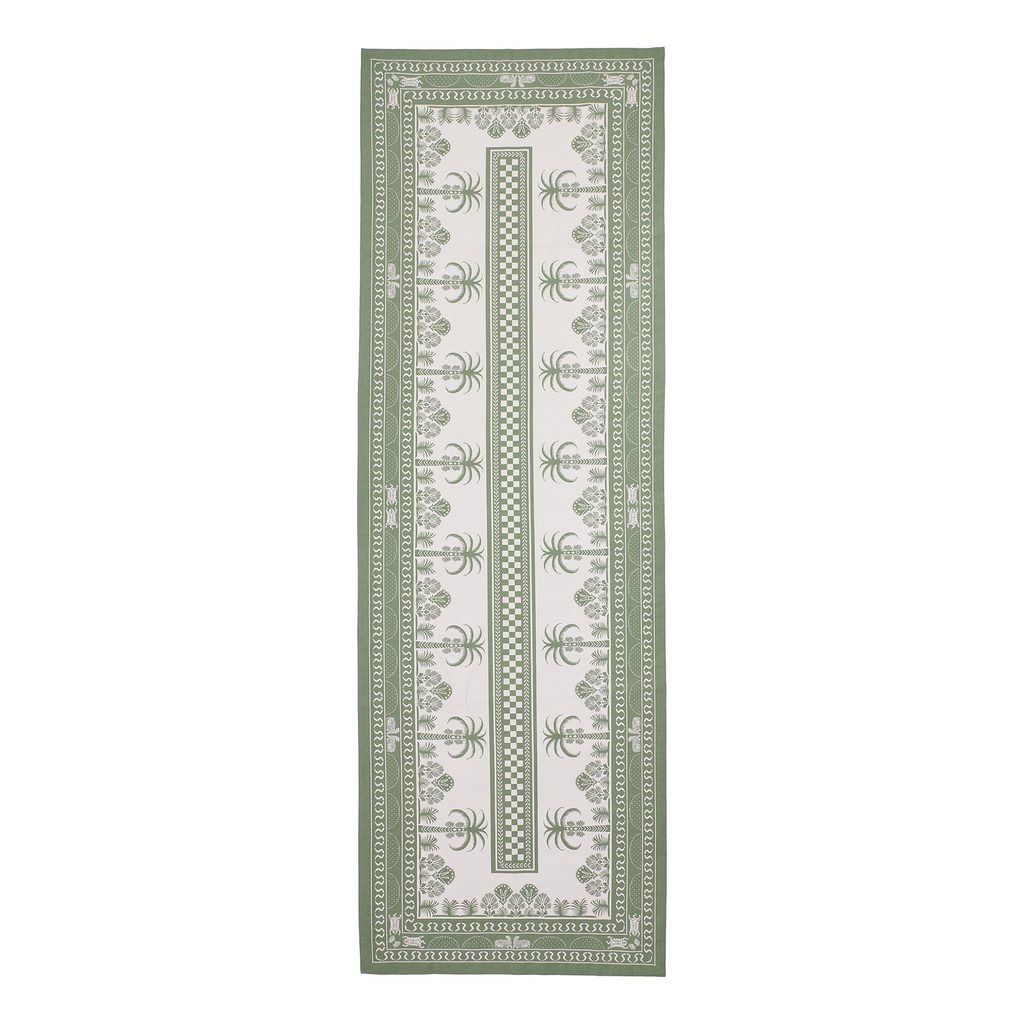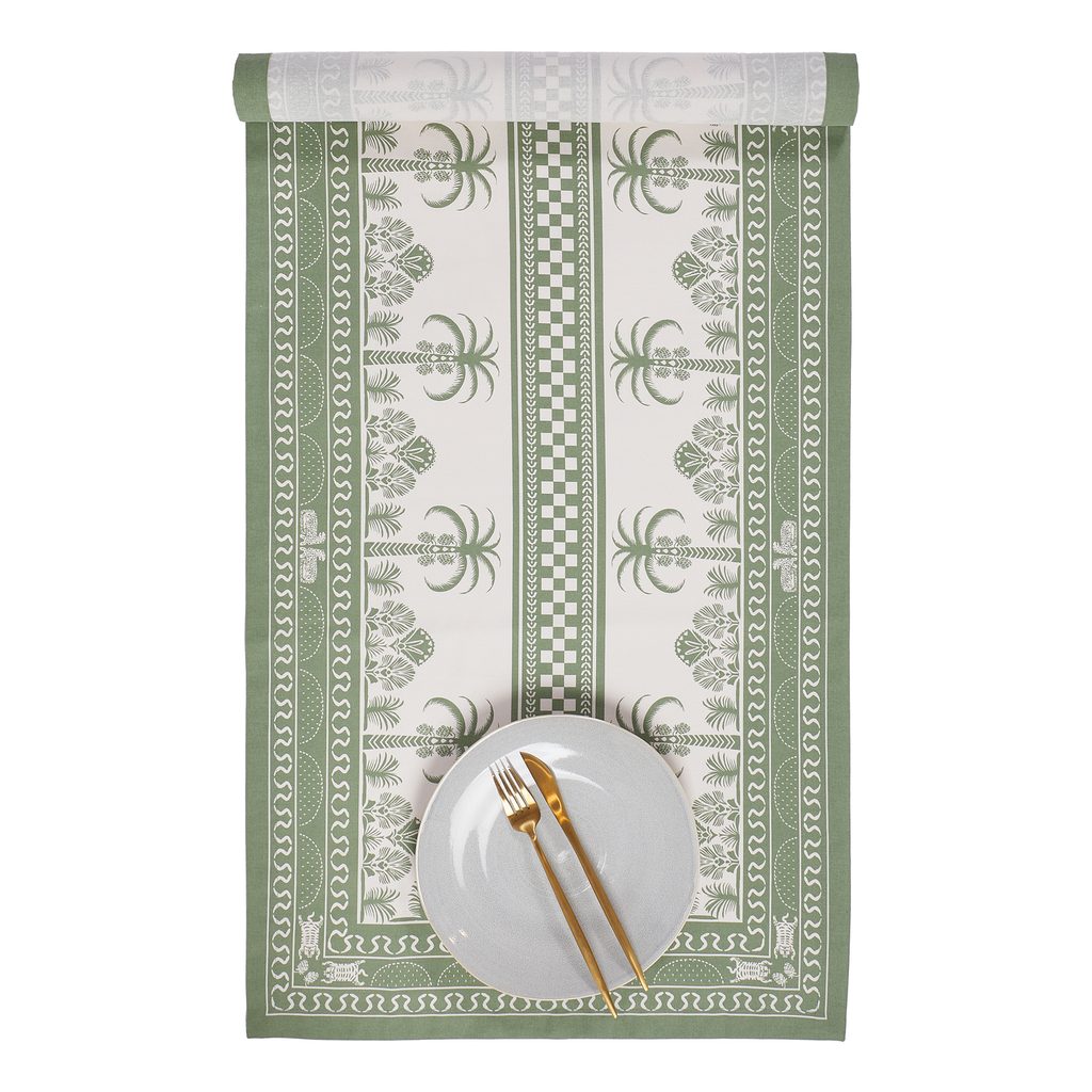 Zelená barva patří mezi nejoblíbenější v současném interiérovém designu, a textilní řada MONTVERDE je tím pravým doplňkem pro Váš domov. Toto stolní prostírání z čisté bavlny spojuje ornamentální a botanické motivy a jeho moderní design se skvěle hodí nejen do jídelny či kuchyně, ale také na balkon či terasu.