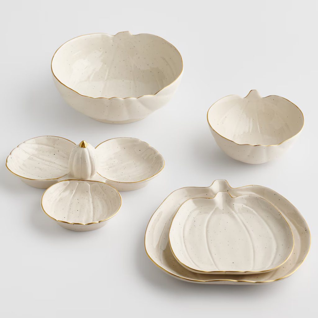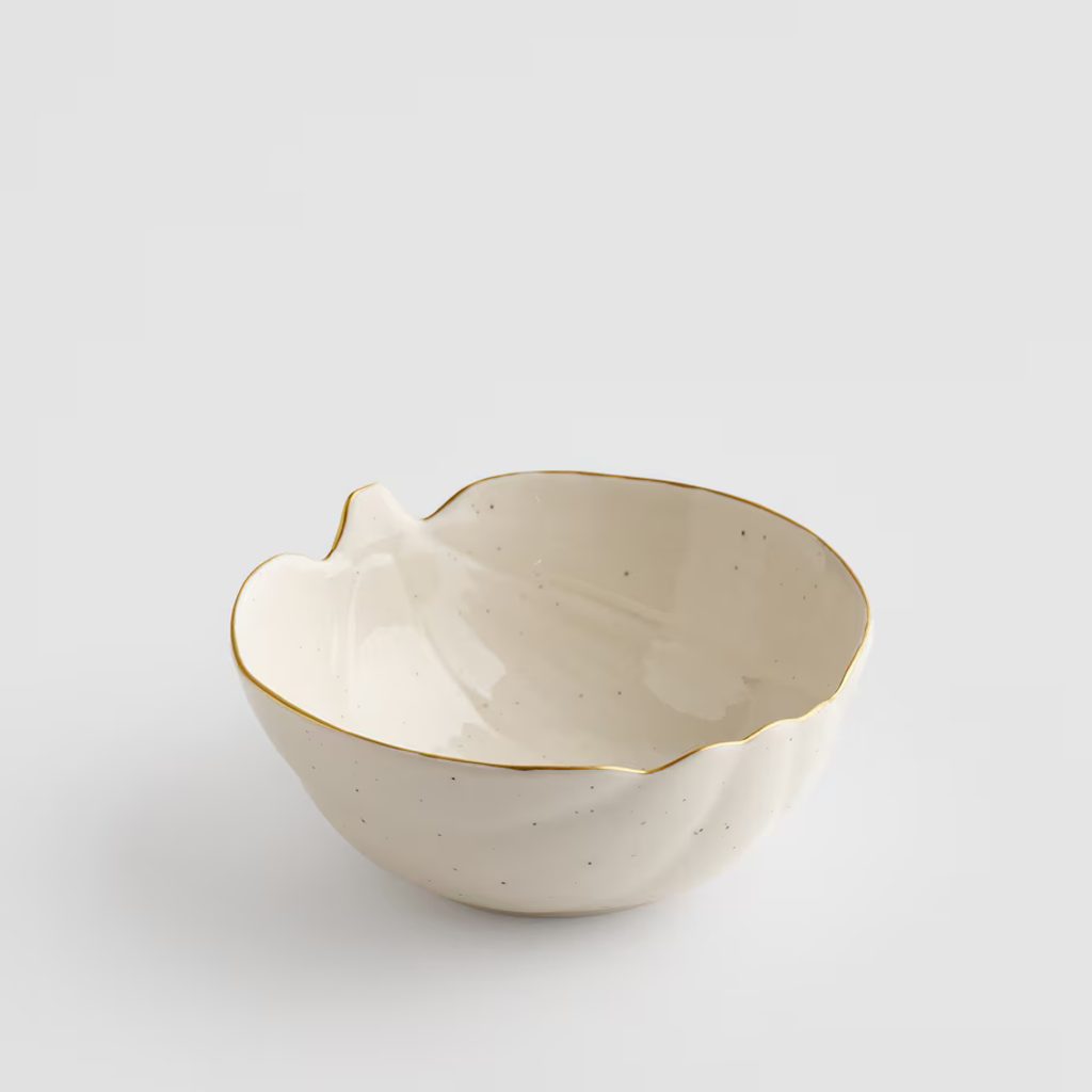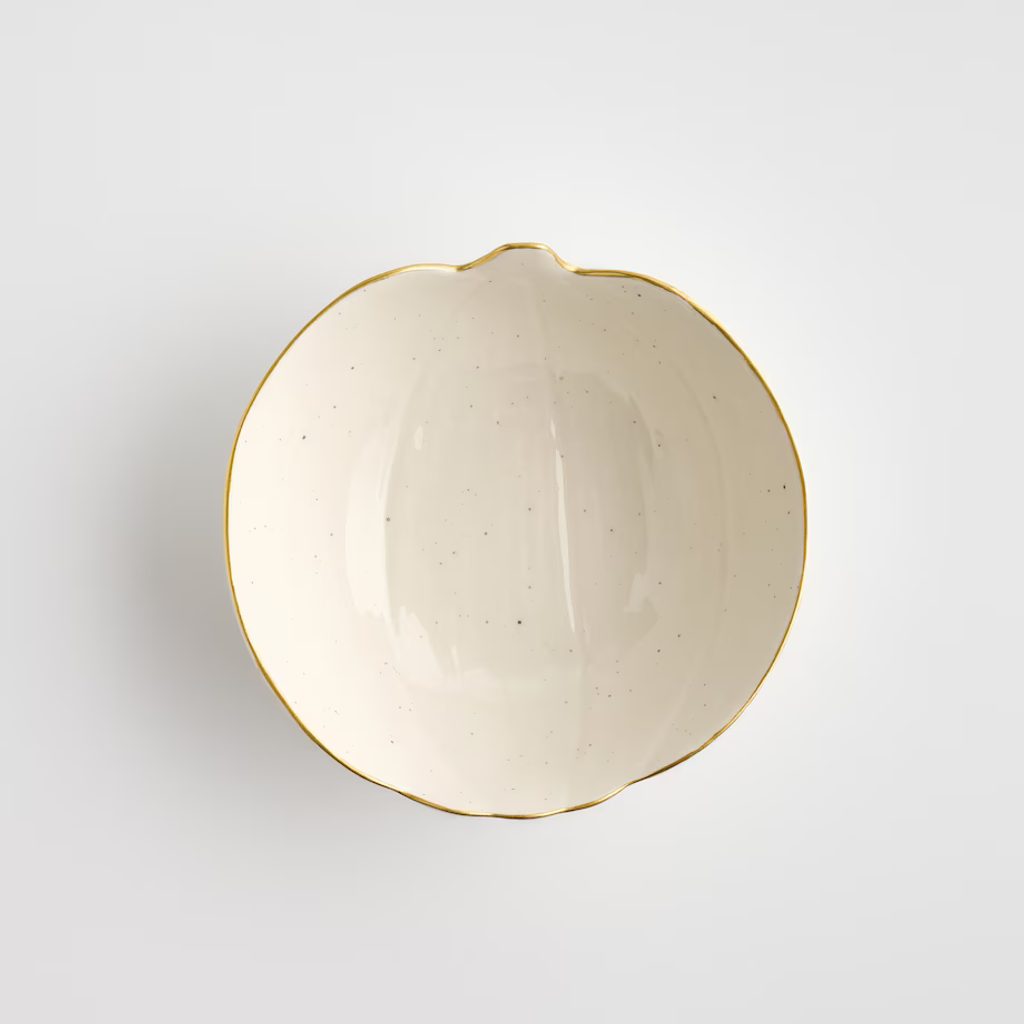 Dýně, jeden z nejvýraznějších symbolů podzimu, se na tomto nádobí snoubí s moderní elegancí. Keramika s náhodným skvrnitým povrchem a zlatým lemem dodává nádech jiskry a vytváří tak působivý podklad pro Vaše podzimní pochoutky.