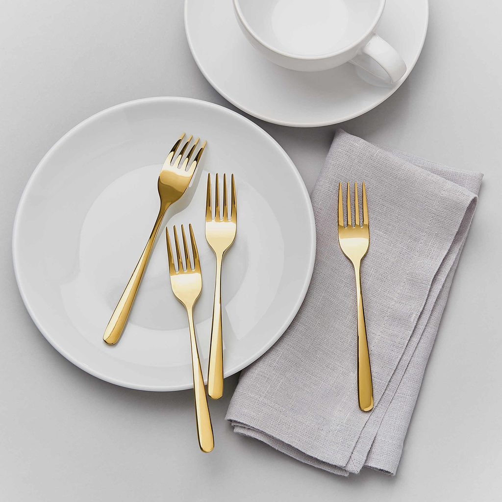 Klasickému stříbru na stole již odzvonilo. Dezertní vidličky QUEENS v lesklém zlatém provedení přináší na tabuli moderní barvy. Set 4 ks z ušlechtilé oceli je k dostání i v růžově zlatém, černém i stříbrném provedení.