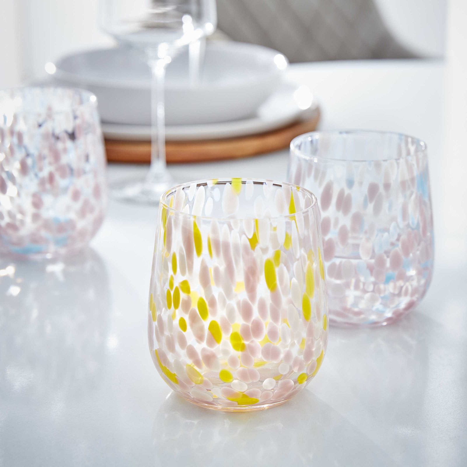 Barevné konfety vždy zvednou náladu, a právě proto je sklenice CONFETTI zdobena vzorem připomínajícím tančící kousky pastelového papíru. Tento hravý design rozzáří každý rodinný oběd či jarní brunch s přáteli! Sklenice je k dostání v několika barevných variantách a doplnit ji můžete i odpovídajícími vázami.