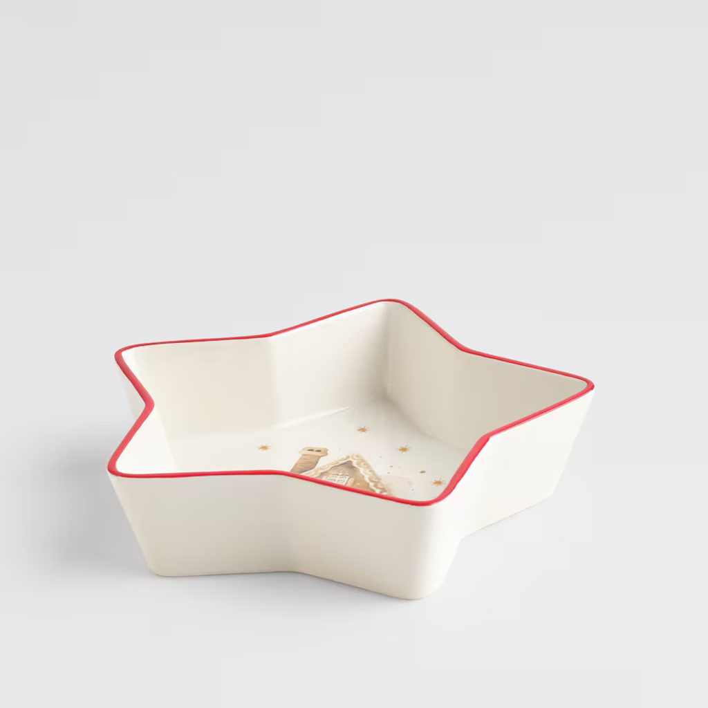 Tato keramická mísa ve tvaru hvězdy s červeným okrajem a pohádkovou zimní chaloupkou uprostřed vytváří skutečnou vánoční atmosféru. Díky zasněžené střeše, ozdobným borovicím a zlatým hvězdám na bohatě propracované ilustraci je ideální volbou pro drobné pečivo, dekorace nebo útulné sváteční servírování.