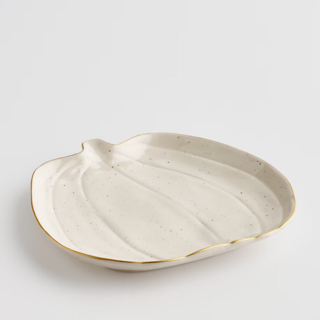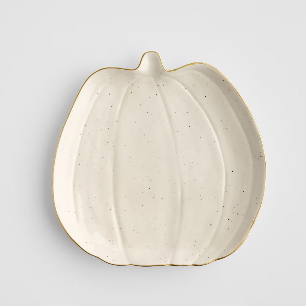 Dýně, jeden z nejvýraznějších symbolů podzimu, se na tomto nádobí snoubí s moderní elegancí. Keramika s náhodným skvrnitým povrchem a zlatým lemem dodává nádech jiskry a vytváří tak působivý podklad pro Vaše podzimní pochoutky.