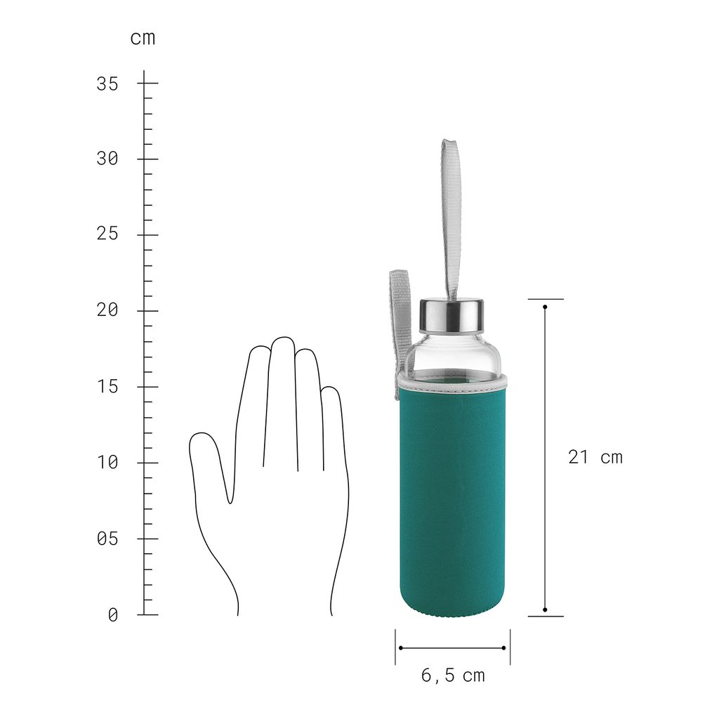 Rozměry: obal: V 16 cm, průměr 7 cm, láhev s držákem: V 21 cm, průměr 6,5 cm, držák: V 2,3 cm, průměr 4,3 cm, objem: 500 ml