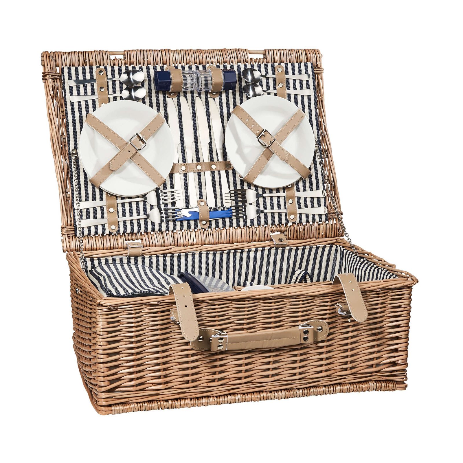 Piknik na zelené louce se skutečným keramickým nádobím - to má styl. Tradiční koš na piknik z vrbového proutí s držadlem, uvnitř je potažený pruhovanou látkou ze lnu, víko je připevněno pomocí kovových řetízků. Všechny díly jsou bezpečně uloženy v koši a navíc je zde dostatek prostoru i pro zabalení několika lahůdek.