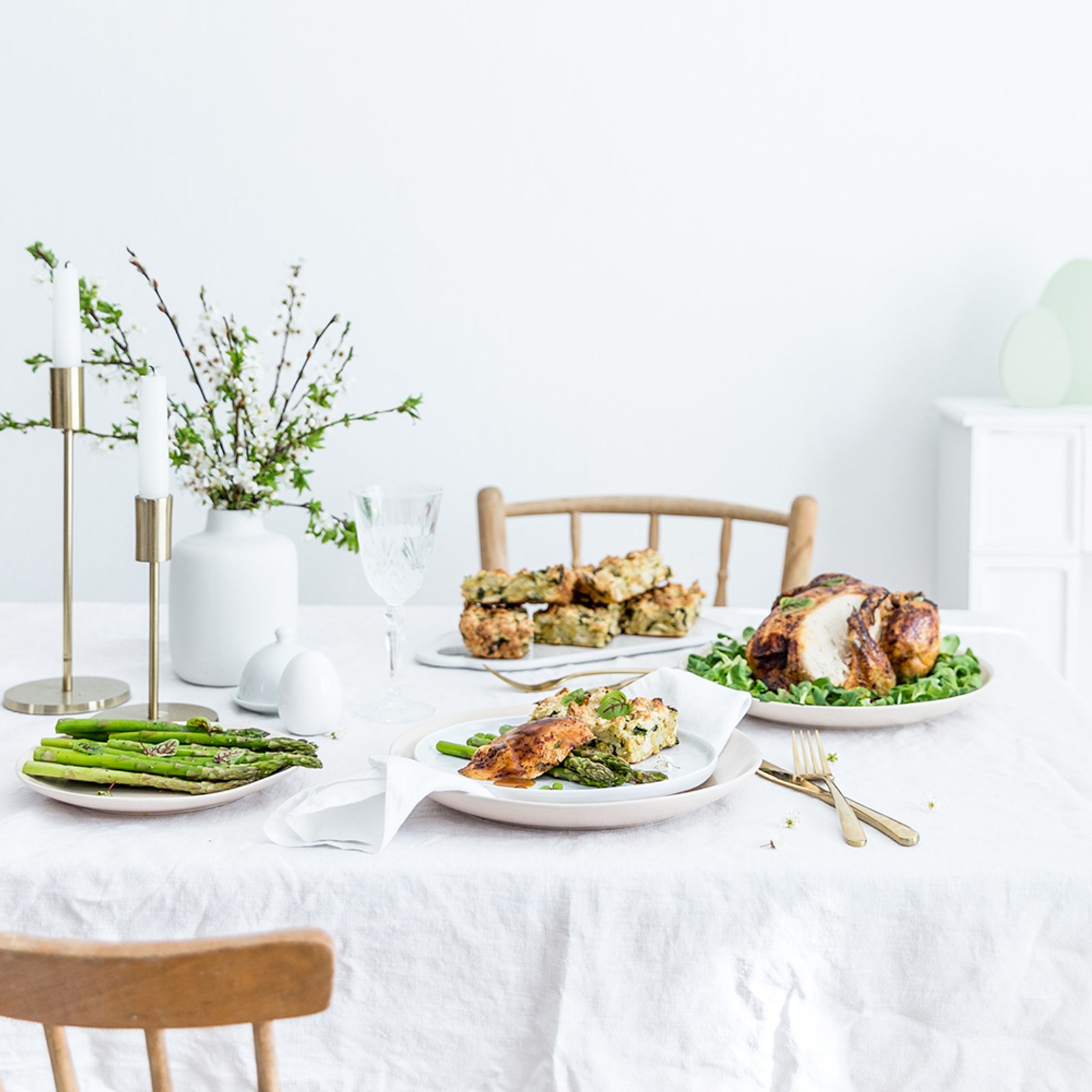 Jarní kuřátko s nádivkou je oblíbený pokrm všech. Využijte sezóny a podávejte navíc s jemně orestovaným chřestem.